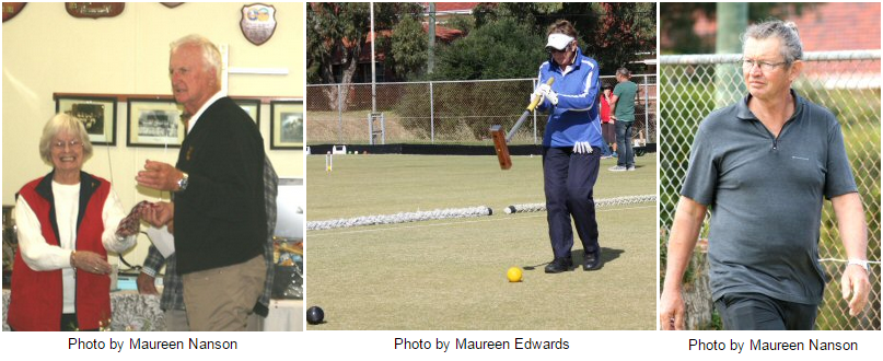 The Golf Croquet Level Play Singles, Block A was won by Max Woolf pictured below receiving his prize from Club Patron Beryl Scott. The runner up Kay Chynoweth is pictured below (centre) lining up a shot during the competition. At right below is Paul Dodson who came third in Block A.