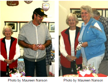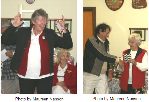 The Golf Croquet Level Play Singles, Block B was won byMaureen Edwards pictured below, left. Runner-up was Owen Keane pictured receiving his prize from club patron Beryl Scott.