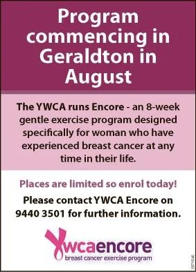 Women who have experienced breast cancer at any time in their lives are being invited to register now for the free after breast cancer exercise program, YWCA Encore, which is running in Geraldton commencing in August 2015. The Encore program supports the physical well-being of women after the trauma of breast cancer surgery or treatment in a nurturing and supportive environment, whether that surgery was a few months ago or 20 years ago. It runs for eight weeks, is tailored for all fitness levels and abilities and incorporates land and hydrotherapy exercises.