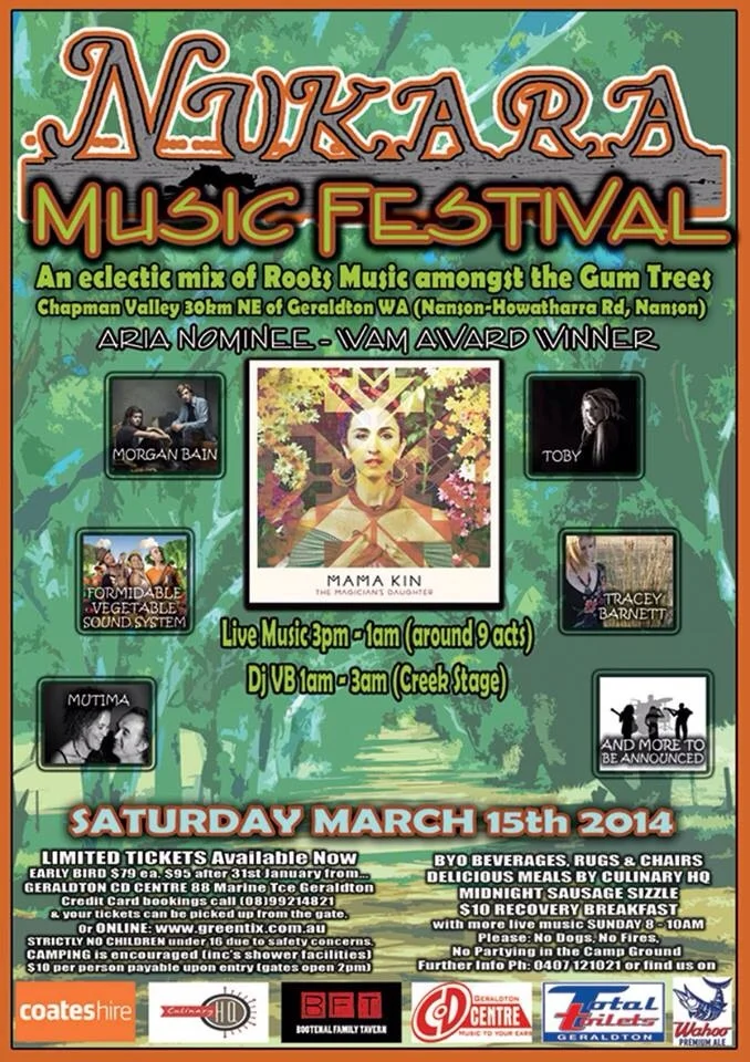 /Some of Aust's great Roots music in one of the best Mid West's outdoor venues in the bush. Act's include MAMA KIN, TOBY, MORGAN BAIN, FORMIDABLE VEGETABLE SOUND SYSTEM, TRACEY BARNETT, MUTIMA, BRIAN ALLEAUME, FOLKLORE Plus DJVB & other local music. TICKETS: $79 Early Bird until 31st January, $95 thereafter. Available from Geraldton CD Centre (08)99214821 And www.greentix.com.au -Location: Nukara Farm 115 Nanson-Howatharra Rd, Nanson WA -Start Time: 15 Mar 2014 15:00 -Contact: 0407121021