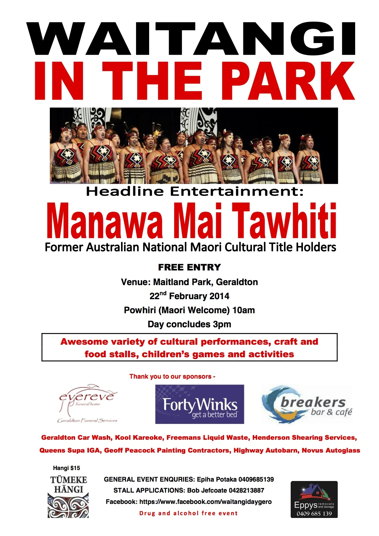 /Waitangi Day in the Park is a family event celebrating a significant day in the history of New Zealand, the signing of the Treaty of Waitangi. Awesome cultural performances and fun activities for everyone. Nau mai, Haere mai! Welcome! Come! -Location: Maitland Park, Geraldton -Start Time: 22 Feb 2014 10:00 -Contact: Epiha Potaka 0409685139